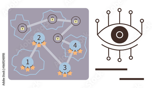 Numbered nodes connected within a network, padlocked for security, paired with an abstract eye symbol. Ideal for cybersecurity, data protection, blockchain, surveillance, network analysis, digital