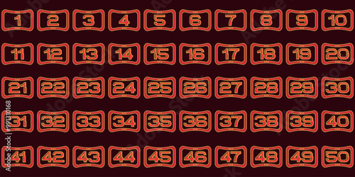 Numbers, 1 to 50 red gold curved box line sadow color effect logo icon set