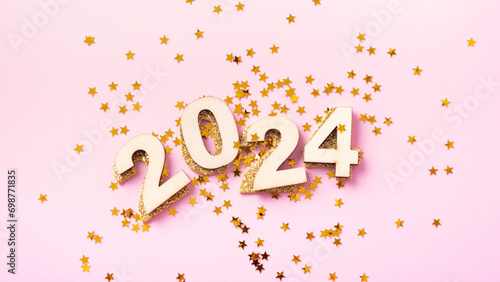 Numbers 2024 and stars on a pink background. Happy new year concept