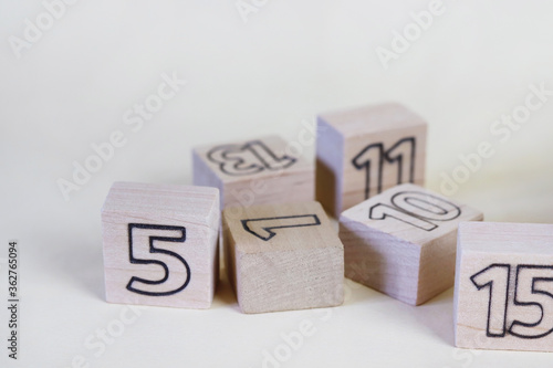 Numbers written on wooden cubes. Copy space - concept of education, child development, back to school.