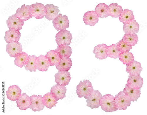 Numeral from 93, ninety three, natural pink flowers of almond tree, isolated on white background