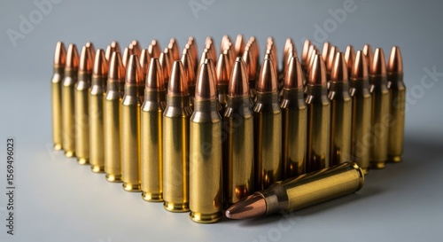 Numerous .223 remington rifle cartridges standing upright in rows