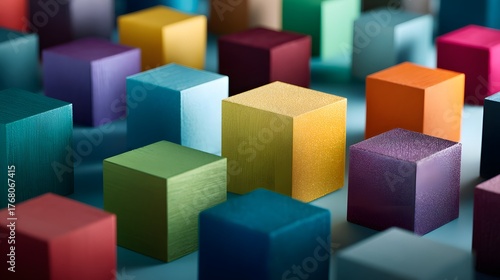 Numerous brightly colored geometric cubes are arranged in a close up perspective