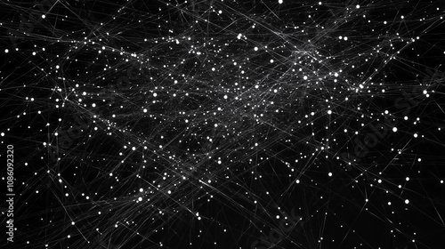 Numerous small, white points of light are dispersed across a black background. Thin, straight lines intersect and crisscross throughout the image, creating a complex network connecting the lights.