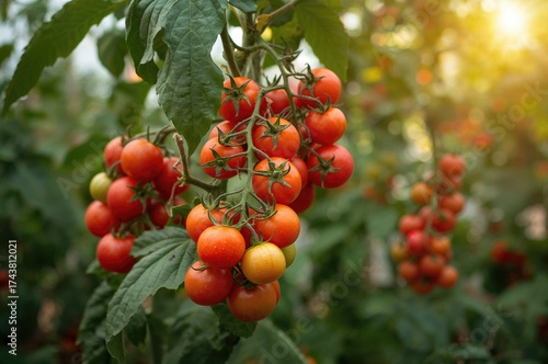 Numerous tomatoes develop on the plant inside the glasshouse
