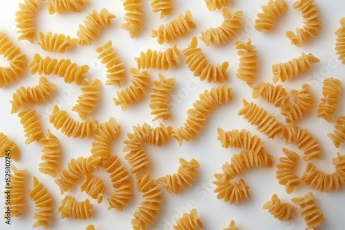Numerous uncooked spiral-shaped pasta pieces spread out on a white surface with bright and clear lighting