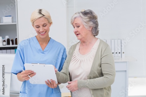 Nurse and senior patient discussing over clipboard