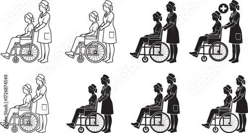 Nurse and wheelchair patient silhouette set, healthcare support, medical care evolution, black vector art, caregiver interaction, hospital scene, disability awareness, icon transition