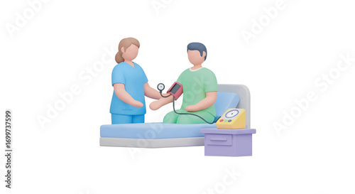 Nurse checking patient's blood pressure in hospital bed with medical equipment, ensuring health and wellbeing in a clinical setting.