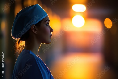 Nurse in silhouette against a glowing backdrop in a healthcare setting at sunset