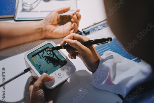 Nurse measuring blood pressure of elderly woman at table, closeup. Assisting senior generation