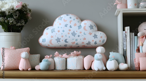 Nursery scene with a cloud pillow soft toys gifts and flowers all in pastel pink blue and white colors on a wooden