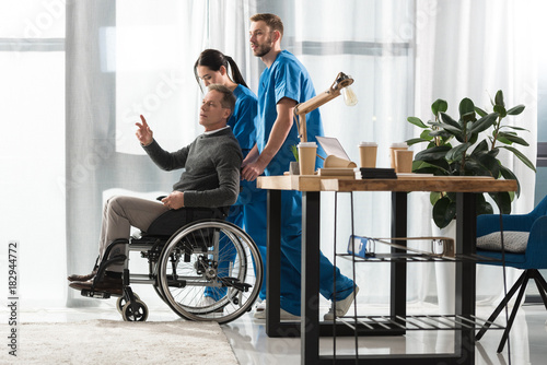 Nurses helping middle aged man on wheelchair