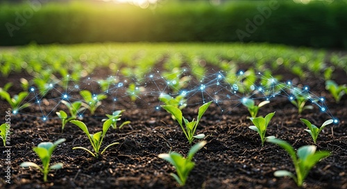 Nurturing future growth, smart technology connects young seedlings in sun-drenched soil, symbolizing agricultural innovation and sustainable farming practices for a bountiful harvest.