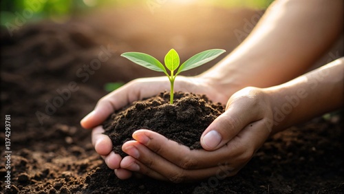 Nurturing green plant in soil with sunlight and caring hands. Created with Ai