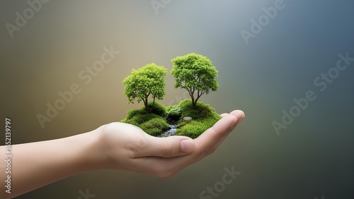 Nurturing nature hand holding miniature green world for environmental care