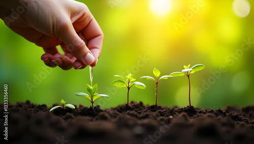 Nurturing New Life, A Human Hand Waters Young Seedlings in Fertile Soil