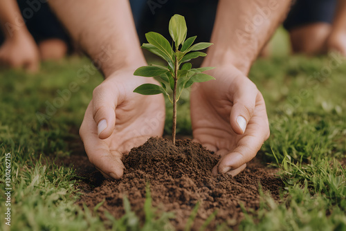 Nurturing new life: Planting a seedling with care, symbolizing growth, sustainability, and environmental stewardship. Hand-planted tree for a greener future.
