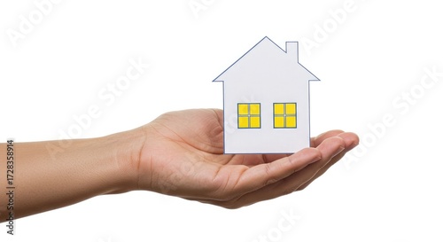 Nurturing your dream home starts with a caring hand holding a paper house symbol against a clean white background, representing security and new beginnings in real estate.