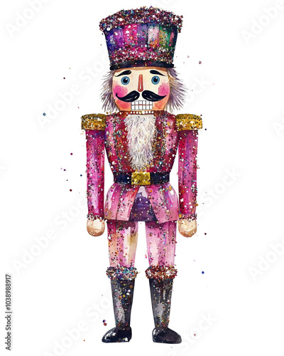 nutcracker figure, dressed in distinct, colorful outfits adorned with sparkling in pink glitter including the hat and boots with a black belt around its waist , festive, holiday or Christmas themes