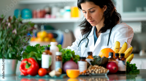 Nutritionist studies dietary supplements surrounded by fruits and vegetables in her office.
