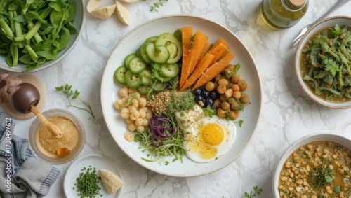 Nutritious Bowl of Fresh Vegetables Chickpeas and Egg on Marble Table in a Culinary Setting