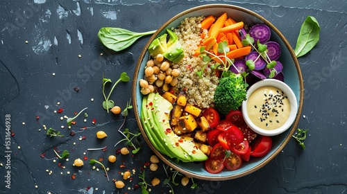 Nutritious Buddha Bowl Food Photography on Dark Background. Vibrant healthy meal with fresh ingredients perfect for diet programs, vegan restaurant menus and organic product packaging designs