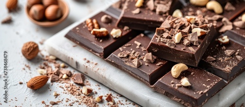 Nuts on marble tray, chocolate fudge candy cut into pieces.