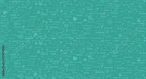 NZ Matariki wallpaper pattern made with icons and text in Maori and english to celebrate the maori new year and the 9 stars