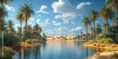 Oasis Serenity: Palm Trees Reflecting in a Calm Desert Lake Under a Sunny Sky