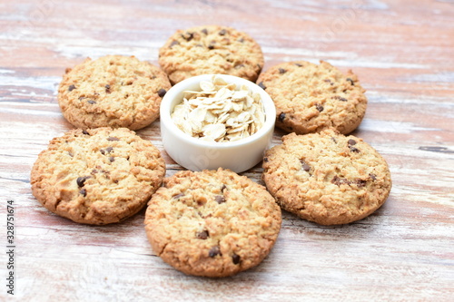 Oatmeal cookies and chocolate chips on light background