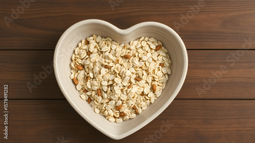 Oatmeal in heart-shaped plate on wooden surface