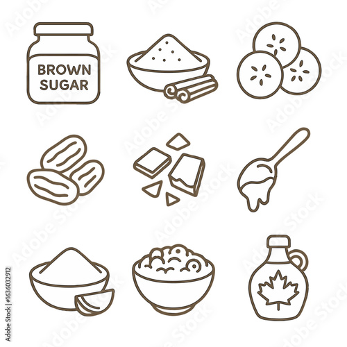 Oatmeal Toppings Icons. Line style icons of Sweet Oatmeal Toppings: brown sugar jar, cinnamon powder, sliced banana, dried dates,