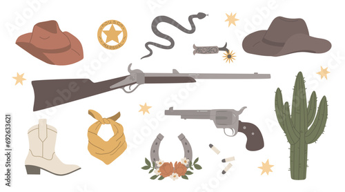 Objects from the Wild West. Cowboy aesthetic. Set of vector elements with gun, cowboy hat, cowboy boots, cactus, sheriff's star, lucky horseshoe, snake
