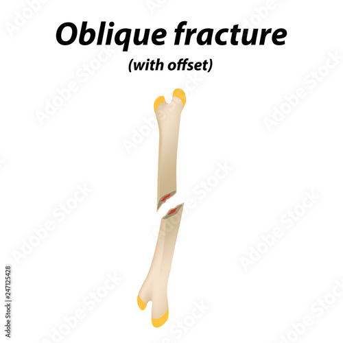 Oblique with offset bone fracture. Infographics. Vector illustration on a lined background.