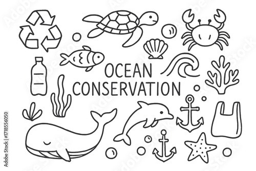 Ocean Conservation Doodles. Hand-drawn doodle illustration Ocean conservation [recycling symbol, fish, turtle, whale, crab, shell, seaweed, coral, wave,