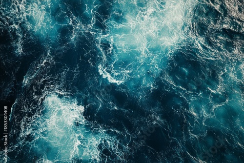 Ocean floor with sunlight filtering through deep water, creating mystical environment. Blue hues dominate scene, rocks scattered on sandy bottom. Neural network AI generated