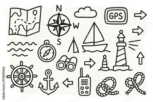 Ocean Navigation Doodle. Hand-drawn doodle illustration Ocean navigation [map, compass, GPS, waves, sailboat, buoy, lighthouse, direction arrows, binoculars,