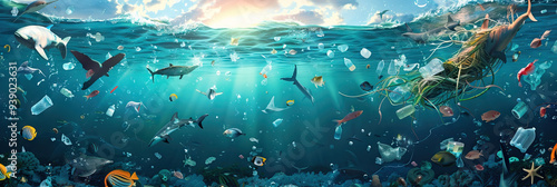 Ocean Pollution: Visuals of marine life entangled in plastic waste, emphasizing the devastating effects of ocean pollution on ecosystems.