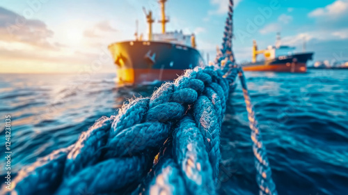 Ocean Sunset: Thick Ropes & Cargo Ships