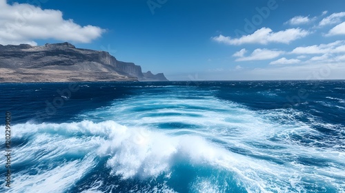 Ocean Wake Reveals Dramatic Coastal Cliffs Under Blue Sky