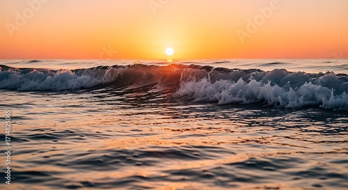 Ocean Wave Crashing at Sunset with Golden Sky and Sun