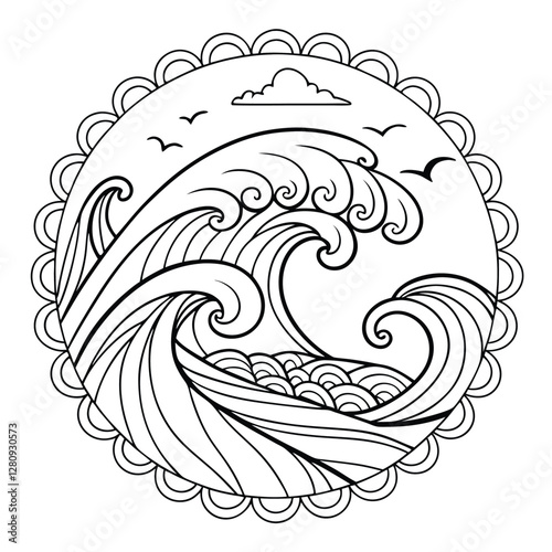 Ocean Wave Mandala Coloring Page: Detailed Sea Illustration with Birds & Cloud, Circular Design for Relaxation & Creative Art Therapy