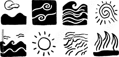 Ocean waves and wind patterns in a black and white abstract vector illustration. This set features various natural elements and designs.