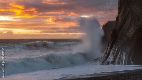 Ocean Waves Crashing Against a Rocky Shore at Sunset.
