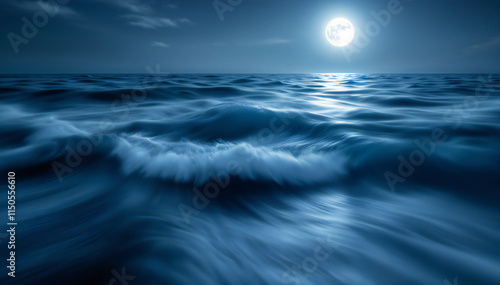 Ocean waves in shades of blue under a bright full moon, with a calm and reflective surface. The sky is slightly cloudy , enhancing the nighttime atmosphere
