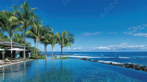 Oceanfront infinity pool with palm trees and lounge chairs.