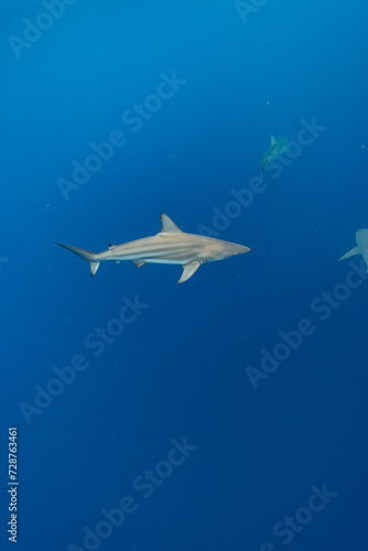 Oceanic Black Tip Swims in Blue Water in front of other sharks