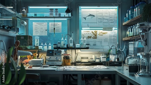 Oceanic Exploration Marine Biologist's Research Station with Business Cards Sea Charts and Specimen Jars Scientific Discovery and Adventure Concept