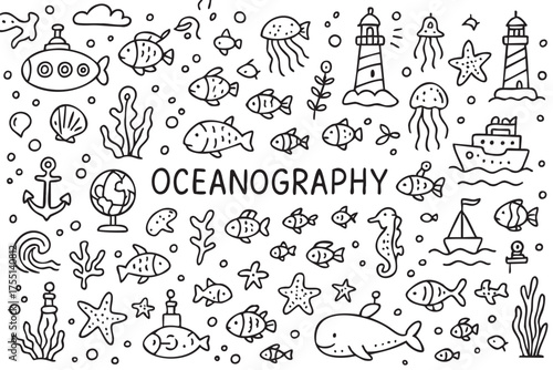 Oceanography doodles: whales, fish, lighthouses, anchors, submarines, starfish. Vector doodle illustration